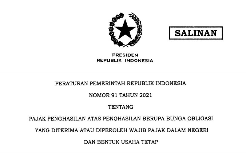 Pemerintah resmi memangkas tarif PPh final atas bunga obligasi yang diterima oleh wajib pajak dalam negeri dan bentuk usaha tetap (BUT) dari 15% menjadi 10% melalui Peraturan Pemerintah No. 91/2021.