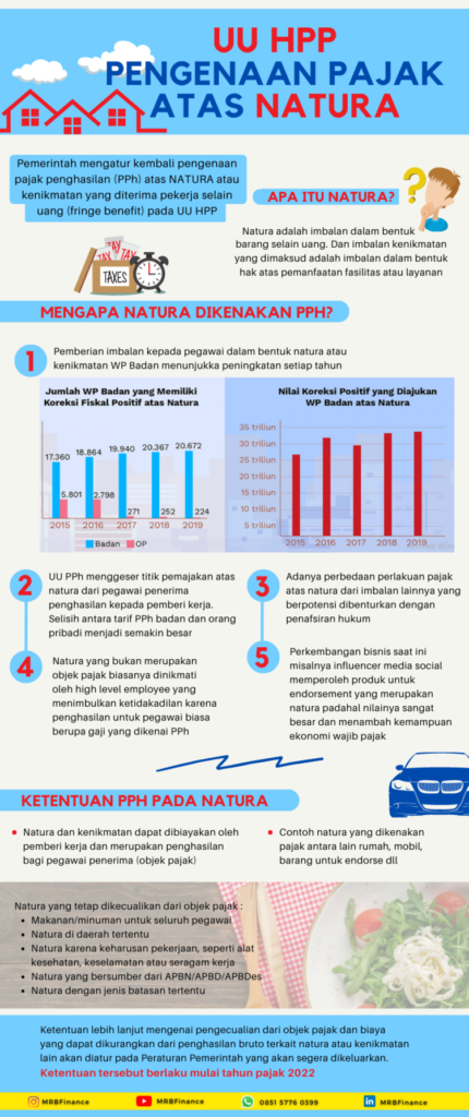 Hal ini ditetapkan dalam UU HPP Nomor 7 Tahun 2021 yang menyebutkan pemberian natura kepada pegawai dapat dibiayakan oleh pemberi kerja atau perusahaan. Sedangkan bagi pegawai, natura menjadi penghasilan yang menjadi objek pajak.