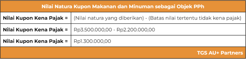 Dengan demikian, nilai kupon untuk natura yang dikenakan pajak sebesar Rp1.300.000,00. Karena pemotongan PPh Natura dilakukan dengan mekanisme PPh Pasal 21, nilai natura yang dikenai pajak sebesar Rp1.300.000,00 akan dimasukkan ke dalam penghasilan bruto karyawan yang bersangkutan.