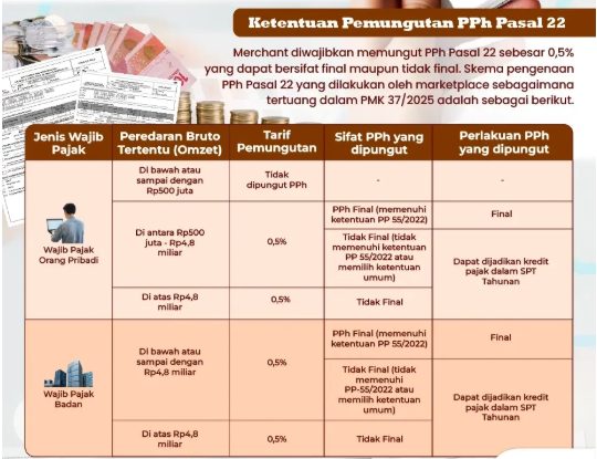 Ketentuan Pemungutan PPh Pasal 22 oleh Marketplace Kementrian Keuangan resmi menerbitkan PMK 37/2025 yag menjadi dasar hukum penunjukkan marketplace sebagai pemungut PPH Pasal 22. Sebagai pemungut PPH Pasal 22 marketplace harus memungut, menyetor, dan melaporkan PPh Pasal 22 atas penghasilan yang diterima atau diperoleh pedagang (merchant) dalam negeri.